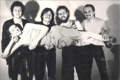 >Phonk<, 25.5.1983, Hansabühne Erlensee: Henner, Eckhardt, Andi verdeckt am Schlagzeug, Jo und Thomas